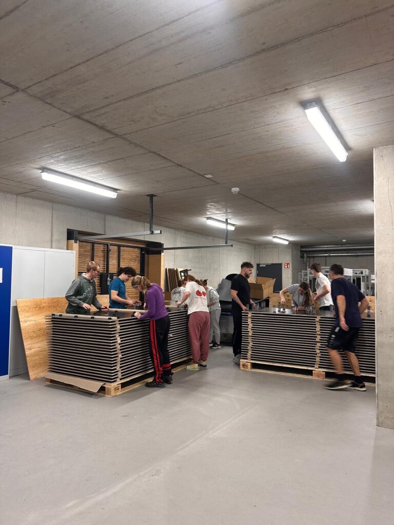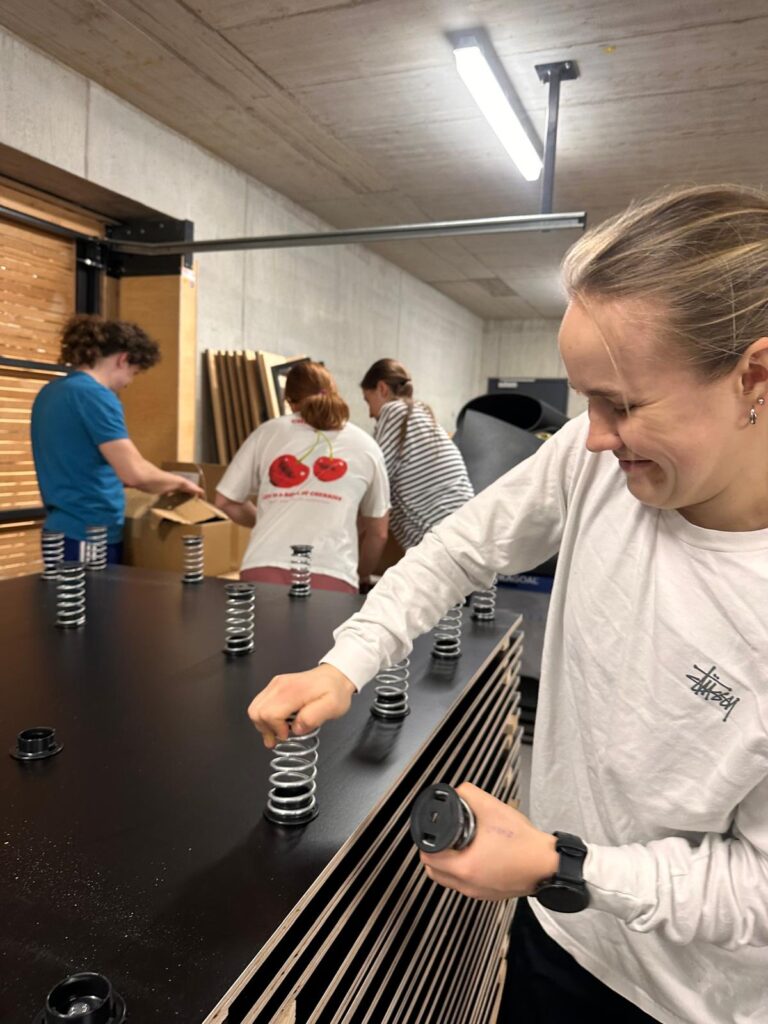 Ganz sportlich, wie unsere Turner und Turnerinnen nun mal sind, wurden die einzelnen Teile gestapelt und die Sprungfedern montiert.