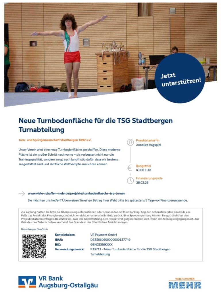 Viele schaffen mehr – unter diesem Motto hatten wir zusammen mit der VR-Bank Augsburg-Ostallgäu die Spendenaktion zur Mitfianzierung der neuen Turnbodenfläche organisiert. Wir haben bewusst das Spendenziel nicht zu hoch angesetzt, denn wir wollten diese Aktion auf jeden Fall erfolgreich abschließen. UND wir haben es geschafft 🙂 – Dank eurer Hilfe und Unterstützung konnten wir jetzt 6.875 € an Spenden und Zuschuss der VR-Bank erzielen. Es ist einfach toll und wir sagen allen Spendern herzlichen Dank.